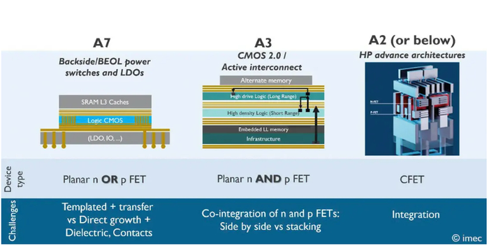 IMEC的逻辑技术路线图展示了纳米片 (NanoSheet) 时代从N2延伸到A10节点,并采用叉片晶体管(ForkSheet),之后过渡到A7及更高节点的CFET(互补场效应晶体管)时代。