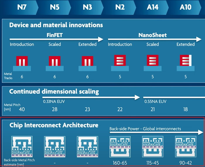 为此,从N2工艺节点开始,半导体行业迎来一项关键创新——背面供电技术,并预计将在A14至A10等更先进节点中持续深化,成为突破性能瓶颈的核心方案。
