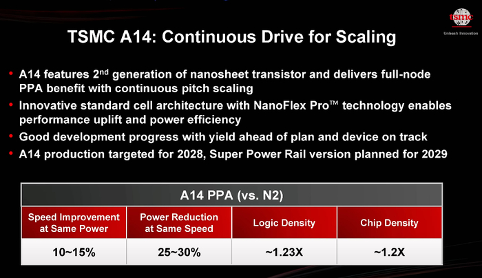 台积电表示,新节点将依赖第二代环绕栅极(GAA)纳米片晶体管,并通过NanoFlex Pro技术提供进一步的灵活性。预计A14将在2028年进入量产,但不支持背面供电。支持背面供电的A14版本计划于2029年推出。