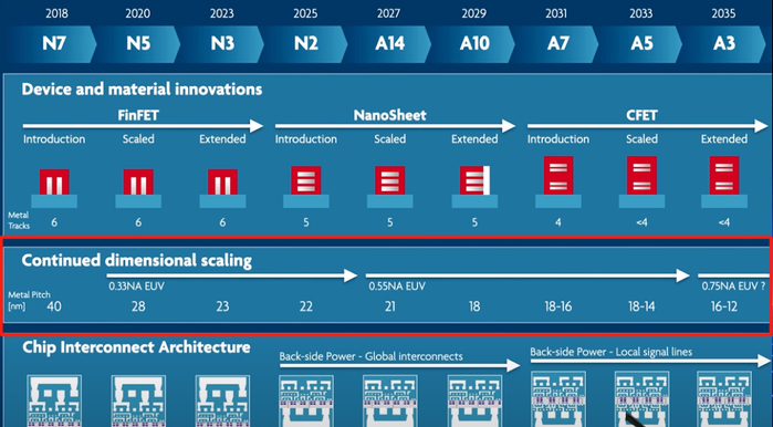 然而,技术创新伴随制造复杂度的飙升,从N2节点引入背面供电时,需在晶圆背面新增纳米级金属互连层,同步优化全局电源网络设计。这也是到A14、A10节点,需要结合High NA EUV光刻技术的原因所在,通过0.55NA EUV光刻技术将供电互连间距缩小至50纳米以下,对薄膜沉积、刻蚀等工艺也提出严苛要求。