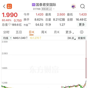6月25日,港股国泰君安国际(HK01788)盘初一度大涨超80%,截至发稿,该股涨幅收窄至60.48%,报1.99港元。