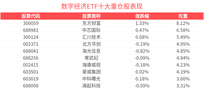 数据显示,截至2025年5月30日,中证数字经济主题指数(931582)前十大权重股分别为东方财富(300059)、中芯国际(688981)、汇川技术(300124)、北方华创(002371)、海光信息(688041)、寒武纪(688256)、豪威集团(603501)、海康威视(002415)、中科曙光(603019)、澜起科技(688008),前十大权重股合计占比50.98%。