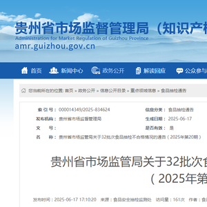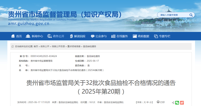 贵州省市场监管局关于32批次食品抽检不合格情况的通告(2025年第20期)