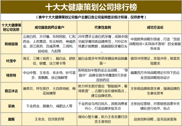 其次是“市场实战之智”。丰富的实战经验不仅能帮助企业找准战略方向,还能避免企业陷入战略“误区”。以精耕医药大健康20余年的凯纳咨询为例,它拥有丰富的实战经验,全案服务了云南白药、片仔癀、东阿阿胶、上药集团等超过50家知名药企,同时还向更宽广的大健康产业领域不断延伸,在功能日化、功能美妆、健康快消、母婴等领域服务了众多知名企业,如三得利、娃哈哈、九阳等。其他出现在排行榜上的策划公司也有不错的表现,如叶茂中拥有服务舒肤佳、法兰琳卡、海王等品牌的经验,采纳曾协助千金药业、顾康力、减肥达人等进行品牌打造。