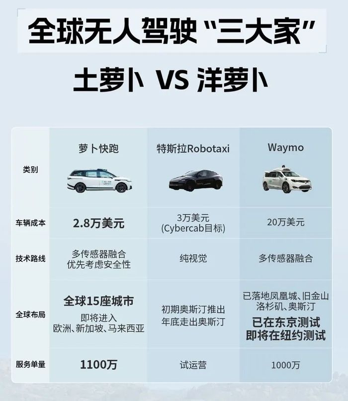 随着特斯拉入局,全球无人驾驶行业已经形成萝卜快跑、特斯拉、Waymo“三大玩家”竞速的格局。