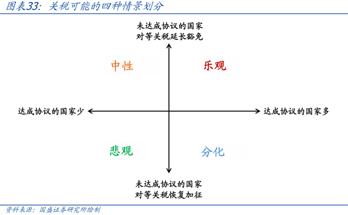 (1)乐观情景:与多个国家达成贸易协议,其余国家的对等关税延长豁免;