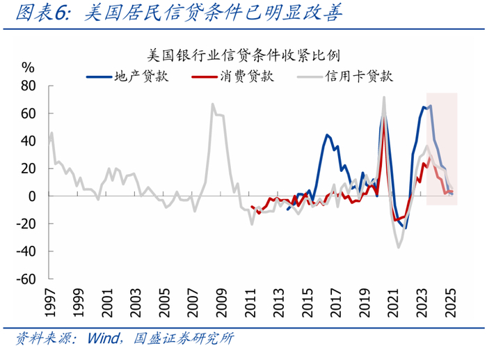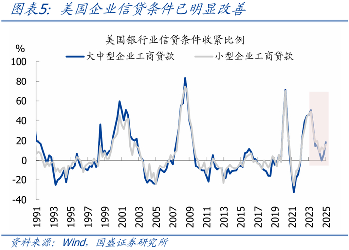 截至2025Q1,美国居民信贷条件已回到2020年之前的水平,并且相较2024Q4进一步宽松;企业信贷条件比2024Q4有小幅收紧,绝对水平处于中性略偏紧的状态,仍明显好于2022和2023年。这反映出,关税对企业信贷条件的影响程度明显大于居民信贷,后续若关税未能缓和,不排除企业信贷条件会进一步收紧,具体幅度有待观察。