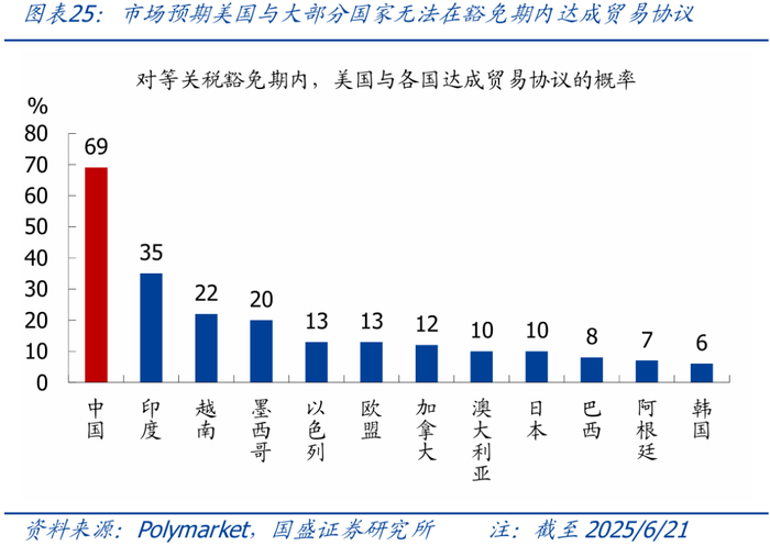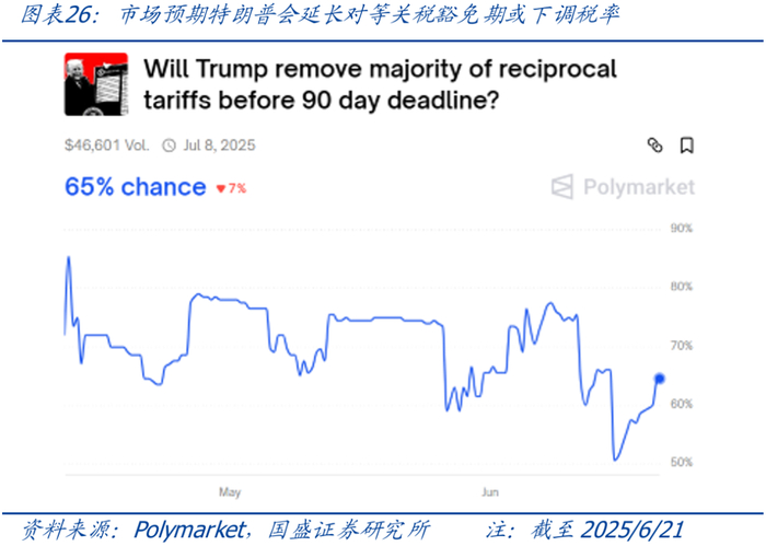按照特朗普此前宣布的规则,美国对中国的对等关税豁免将持续至8月12日,对其他国家的豁免将持续至7月9日。博彩网站Polymarket的交易结果显示,截至6月21日,市场预期美国在豁免期内仅有希望和中国达成贸易协议,概率为69%,其余国家的概率均低于40%;不过与此同时,市场也预期有65%的概率特朗普会在豁免期结束后继续延长豁免。这一结果反映出,市场认为90天对于贸易谈判而言时间太短,而特朗普仍有较强的谈判意愿,因此大概率会延长豁免期继续推进谈判。