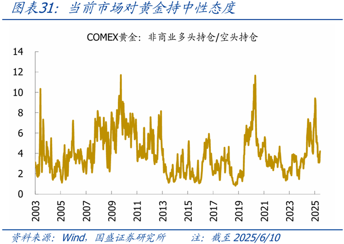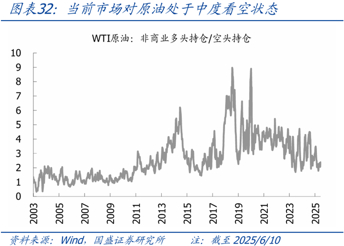 >原油:WTI原油多空比处在历史偏低水平,反映出市场对油价中度看空。今年在关税升级的背景下OPEC开始增产,令油价雪上加霜。需注意的是,近期的伊朗-以色列冲突导致油价大幅抬升,而持仓数据仅更新到6/10,尚未反映伊以冲突的影响。在地缘冲突和关税结果均悬而未决的情况下,后续油价走势高度不确定。