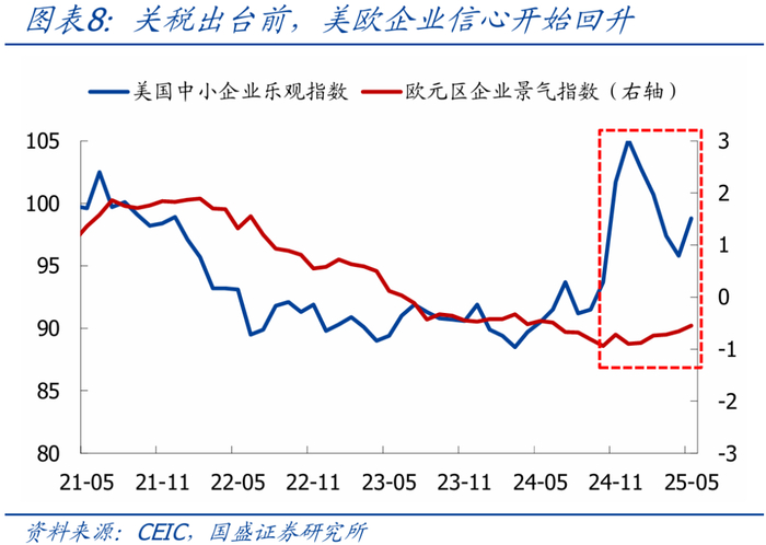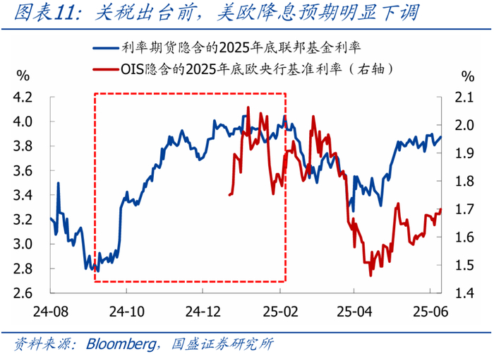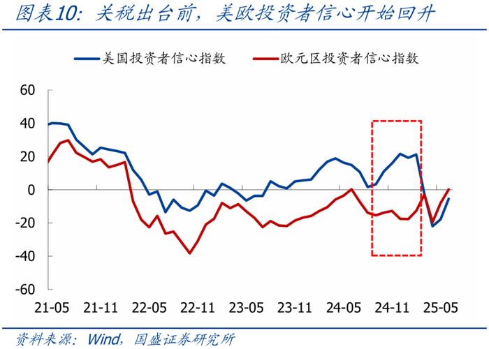 除衰退预期降温之外,关税出台前,美欧各类经济软指标也开始走强,市场降息预期也出现明显下调。例如,2024年中至2025年初,美欧企业信心指数、消费者信心指数、投资者信心指数均已出现连续回升;2024年9月时,市场预期2025年底美联储将降息至2.8%左右,而2025年初时这一预期已调整至4.0%左右。