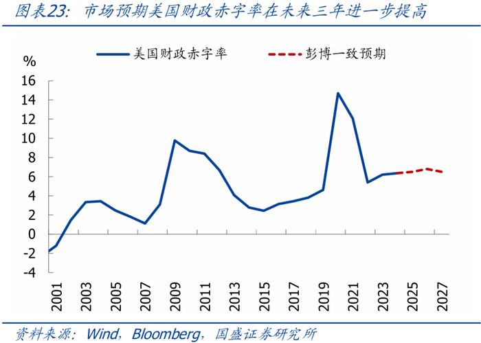 由于特朗普竞选时曾承诺大幅削减财政赤字,甚至专门任命马斯克成立“政府效率部”,市场在2024年底时普遍预期未来美国财政政策会趋于收紧。然而目前看来,马斯克在美国政府内部的权力并没有想象的大,与特朗普的关系也出现裂痕,已于5月底从政府效率部离职;与此同时,特朗普推出“大美丽法案”(Big Beautiful Bill),旨在扩大减税并提高债务上限,该法案已在众议院通过,参议院尚未投票。彭博调查显示,截至6月下旬,市场预期2025-2027财年美国财政赤字率均将保持在6.5%以上的历史较高水平,相比2023和2024财年小幅抬升。