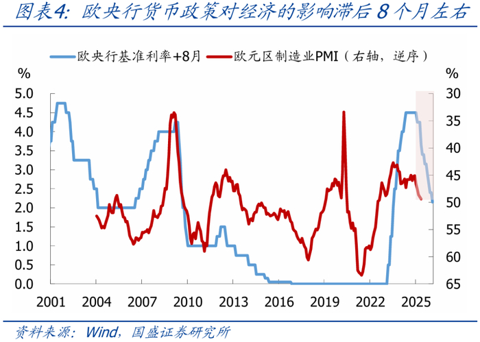 2022-2024年全球经济大幅放缓,一个很重要的原因是全球央行大幅加息。不过自2024下半年以来,全球央行已开启降息周期,截至2025年6月,美联储已累计降息100bp,欧央行已累计降息235bp。央行降息会对经济形成提振,只是政策的传导存在一定时滞。历史上看,美联储货币政策传导时滞在1年左右,欧央行则在8个月左右。本轮美联储降息始于2024年9月,欧央行降息始于2024年6月,按历史规律推导,美国经济可能在2025Q3或Q4迎来拐点,而欧洲经济则会在2025年初迎来拐点。