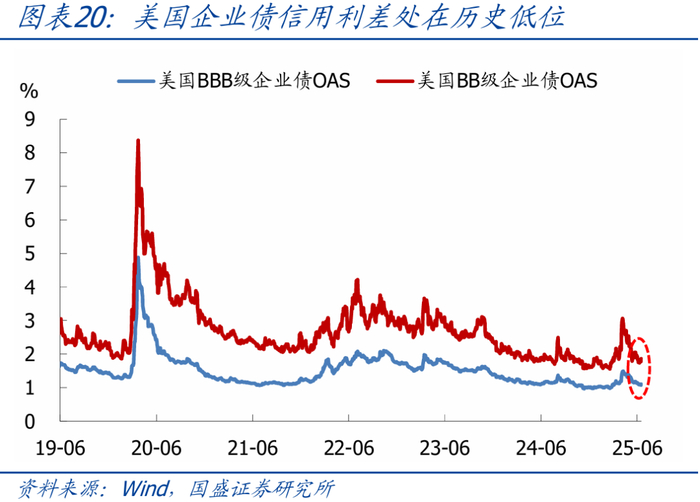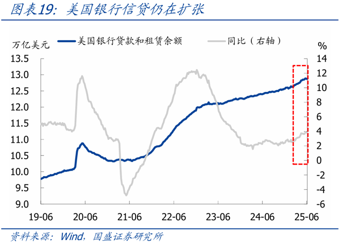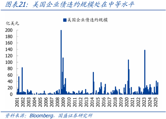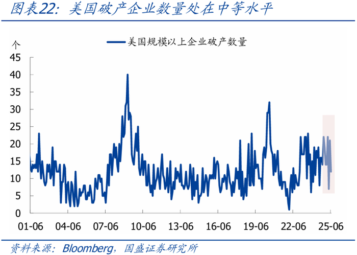 由于关税是2月开始出台,而杠杆率数据是季度频率,且目前只更新到2024Q4,无法直接观测到最新情况。不过资产负债表是个慢变量,短期内基本不会发生实质性变化,此外也可以借助一些高频指标从侧面进行辅助判断。例如,截至6月中旬,美国银行业信贷规模仍在扩张,企业债信用利差处在历史低位,企业债违约规模和企业破产数量均处在历史中等水平,以上数据表明,目前美国企业资产负债表依然十分健康,并且信用环境维持宽松。而居民资产负债表通常比企业更加稳定,鉴于美国失业率仍维持低位,可以推断目前美国居民资产负债表也十分健康。