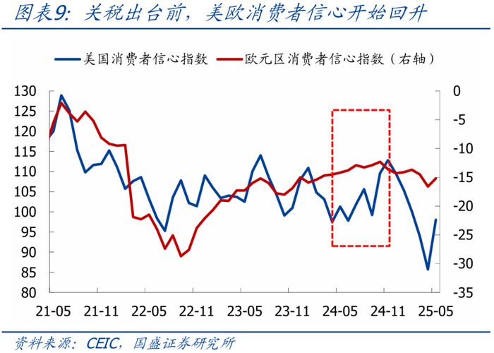 2.关税出台之前,市场经济预期已开始改善。市场对美欧经济衰退的预期在2023年达到最高点,之后持续降温,2024年底时美国经济衰退概率已降至20%,欧洲为30%。今年2月关税出台前,美欧企业信心、消费者信心、投资者信心等指标均出现连续回升,降息预期也大幅下调。