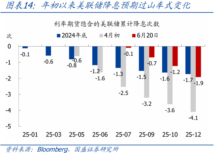 过去几个月,市场对美联储降息的预期经历了过山车式的变化:在2月关税出台之后,市场一开始是往“衰退+大幅降息”的方向交易;但由于对等关税暂时豁免以及经济数据表现良好,市场从5月开始转向了“滞胀+小幅降息”。目前市场降息预期已经重新回到去年底的水平,若后续贸易谈判进展顺利、关税适度下降,同时经济数据依然表现良好,市场可能进入“再通胀交易”,届时美联储降息预期可能进一步下调。
