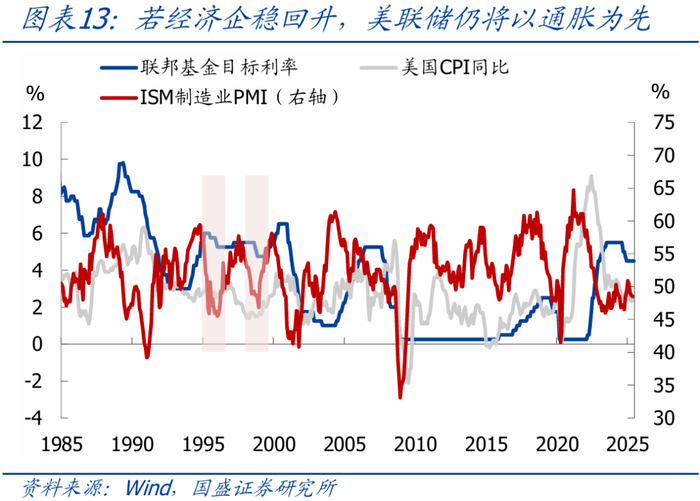历史经验显示,如果经济陷入衰退,即使通胀高企,美联储也会大幅降息来稳定经济,例如1990、2001、2008年;但如果经济软着陆并且触底回升,同时通胀存在上行压力,则美联储降息空间将十分有限,例如90年代中期。从过去三次FOMC会议的表态来看,目前美联储认为经济下行风险整体可控,通胀上行风险是更大的担忧,因此对继续降息持谨慎态度,这也与我们前文对经济内生动能的分析结论相一致。