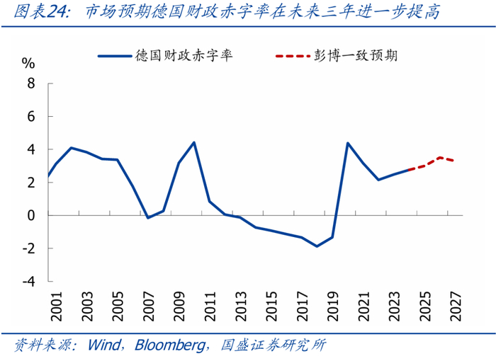 此外,欧洲财政政策也出现了明显的扩张迹象。2025年3月,德国推出一揽子财政支出计划,主要内容包括:取消国防开支限制、允许州政府举债、设立5000亿欧元专项基金等;无独有偶,欧盟委员会也推出了“重新武装欧洲”计划,希望通过提供贷款支持、放宽债务约束等方式来增加国防开支。彭博调查显示,截至6月下旬,市场预期2025-2027财年德国财政赤字率将从2024年的2.8%抬升至3.5%左右。