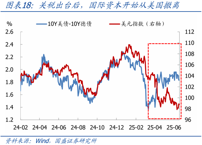 从资产价格表现来看,2月-5月期间,虽然全球股票市场均出现大幅下跌,但美股跌幅明显大于其他市场;与此同时,美债也遭到了抛售,引发美国与其他国家的利差走扩,而美元指数却不涨反跌,表明大量投资者抛售美国资产后选择将美元兑换成其他货币。往后看,若关税不能缓和,市场对美元资产的信心将难以恢复,甚至不排除有些国家会选择抛售美债和美元外汇来作为反制手段。