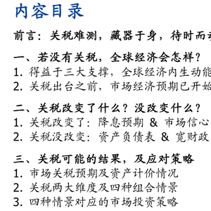 核心结论:受益于资产负债表修复、宽货币、宽信用,全球经济内生动能并不弱。特朗普关税出台前,市场已开始交易美欧经济软着陆。关税扰乱了原本的经济运行节奏,但目前关税谈判结果以及对经济的影响程度存在较大不确定性。我们对关税做出了四种情景假设,并分析了四种情景下的市场应对策略。