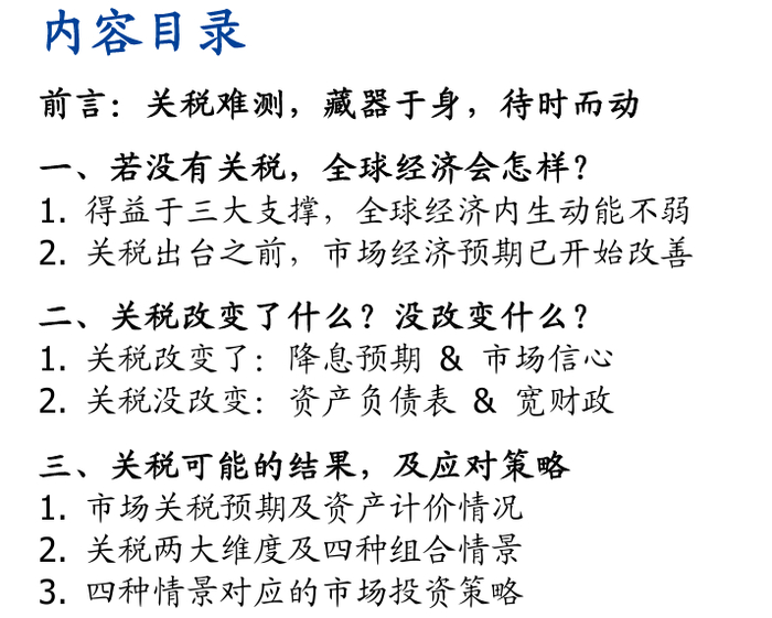 现阶段的海外宏观环境,影响最大的变量无疑是关税。然而,关税最终会如何演化难以预测,关税对经济的影响程度也难以准确估计。我们认为,相比预测关税前景,更为重要的是深入分析经济内生动能,并进一步厘清关税改变了什么、没改变什么。基于此,可以对关税结果做不同情景假设,分别制定相应的市场应对策略,做到“藏器于身,待时而动”。