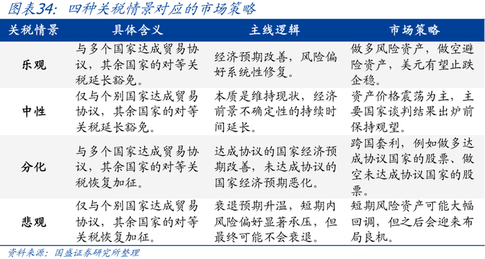 >乐观情景:与多个国家达成贸易协议,其余国家的对等关税延长豁免。在此情景下,经济预期将明显改善,带动全球风险偏好出现系统性修复,应做多股票、大宗商品等风险资产,做空国债、黄金等避险资产。