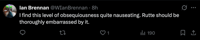 美国总统唐纳德·特朗普当地时间24日在其自创社交平台上公布了北约秘书长马克·吕特的一条私人短信截图,吕特在短信中对特朗普对伊朗采取的“果断行动”大加赞赏。然而“今日俄罗斯”(RT)、美联社等多家媒体注意到,这条短信极尽溢美之词,“谄媚的”内容很快引发争议,有网友直言不讳说,“我感觉有点反胃”。
