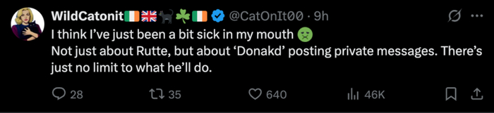 有网友表示,“我感觉有点反胃。不仅仅是因为吕特,还因为‘唐纳德’公开私人短信。他的所作所为简直毫无底线”。