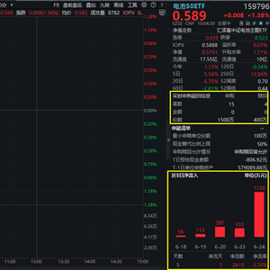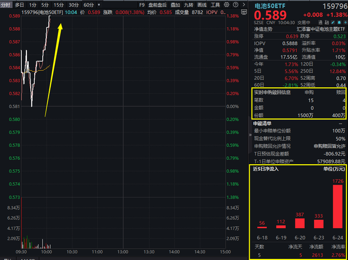 6月25日 10:04,固态电池概念股反复活跃,同类规模领先、费率最低档的电池50ETF(159796)强势冲高,放量涨超1%,冲击三连阳,成交额快速突破3000万元!资金盘中再度净申购电池50ETF(159796)1100万份,近5日已连续大举吸金超2600万元。