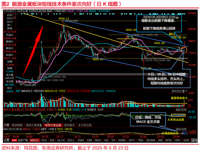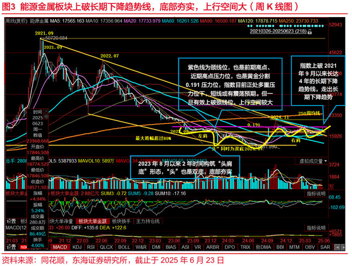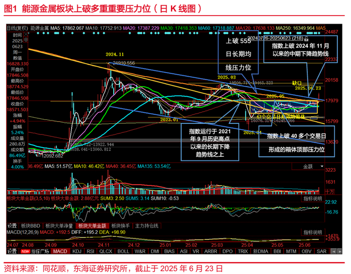 能源金属板块携量上破多个重要压力位。能源金属板块于2025年6月23日收长阳线,一举上破近期超40个交易日横盘震荡形成的箱体顶部压力位;上破555日长期均线压力位;上破2024年11月与2025年3月的两个高点形成的中期下降趋势线;运行于2021年9月与2022年7月两个高点形成的长期下降趋势线之上。指数上破多重重要压力位, 2021年9月形成的历史高点以来长期下降趋势已经扭转。