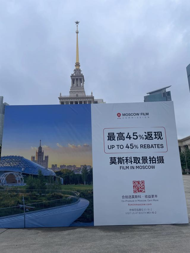 当然,最醒目的要数俄罗斯。在上海电视节主场上海展览中心正门C位打出了“莫斯科取景拍摄,最高返现45%”的巨幅展板。