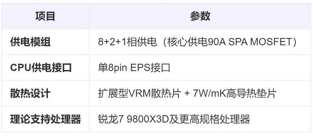 供电方面,微星MPG B850I EDGE TI WIFI刀锋钛主板这次采用了8+2+1供电模组,核心供电采用90A SPA供电设计,远超常规ITX主板,理论上可以满足目前AMD平台锐龙7 9800X3D这个级别处理器的需求。