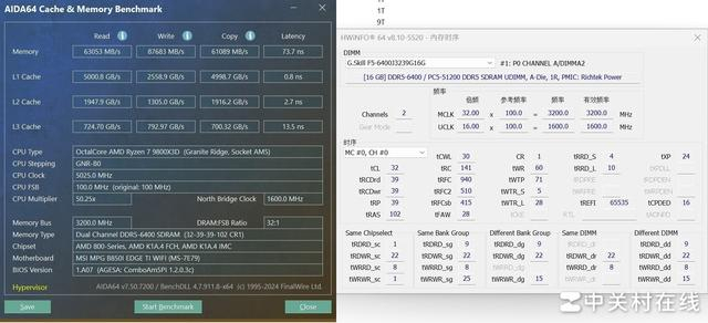 我们首先针对微星MPG B850I EDGE TI WIFI刀锋钛主板的内存兼容性以及超频的能力,先来看一下EXPO 6400MT/s内存在这款主板上的性能表现,使用AIDA 64测试了读写表现。
