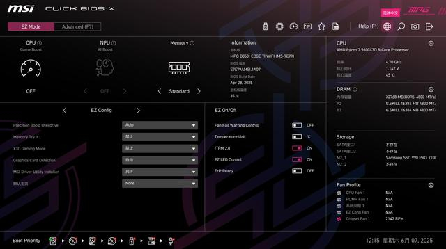 下面我们来看一下这款主板的BIOS,新一代微星主板都升级为了CLCIK BIOS X界面,相较于以往更加人性化便于操作。比如在EZ Mode主菜单中我们就可以快速调整大部分OC功能。包含PBO、Memory Try lt 、X3D Gaming Mode等。