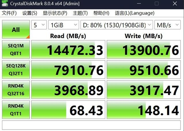 这款PCIe 5.0固态在微星MPG B850I EDGE TI WIFI刀锋钛主板上连续读取速度达到14472.33MB/s,连续写入速度达到13900.76MB/s,跑出了PCIe 5.0固态在AMD锐龙9000平台上的表现。