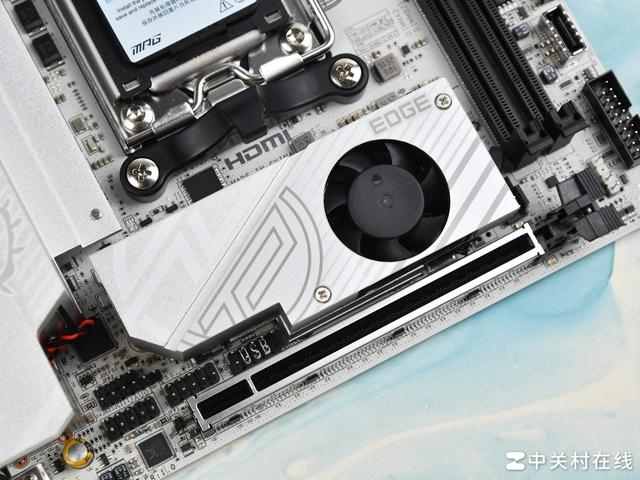 而且这款主板正面的PCIe 5.0 M.2插槽装甲不仅厚重,微星还额外准备了一个双滚珠轴承风扇用于散热,以应对PCIe 5.0 SSD的高压发热问题,会带来一些噪音,但散热效率更高。