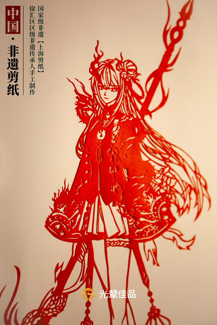 这些非遗与二次元跨界的剪纸作品,均出自石勤玲所在的徐汇枫林剪纸团队。“在剪二次元造型的时候,角色人物的脸部表情很重要,她的眼睛、眼珠、眼睫毛,都要非常细致地刻画出来。有一点细微差异,在游戏玩家看来就会很明显。”2016年,29岁的石勤玲被评为“上海剪纸”徐汇区区级非遗传承人,是当时“上海剪纸”最年轻的传承人。在这位年轻的传承人心中,非遗的传承与传播离不开创新,“我一直追求新的变化,比如使用不同的材质、剪不同的题材,或者和其他非遗、游戏项目跨界合作,碰撞出新的火花”。