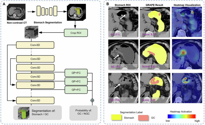 GRAPE 检测胃癌原理图。图 A:GRAPE 模型架构。图 B:GRAPE 工作原理,模型先在平扫 CT 影像上分割出胃部区域( 黄色区域 ),然后在胃部区域中分析是否有肿瘤( 红色区域 )。