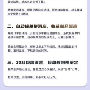 过去,车主通过自动抢单抢到的订单不一定每次都满意,故对自动抢单有些不太确定。此次升级,通过赋予车主更精细的路线规划权限(自定义途经点、周期性设置等)和更灵活的接单偏好设定(顺路程度、座位数等),大幅提升了自动抢单的精准度和确定性,让接单更随心。