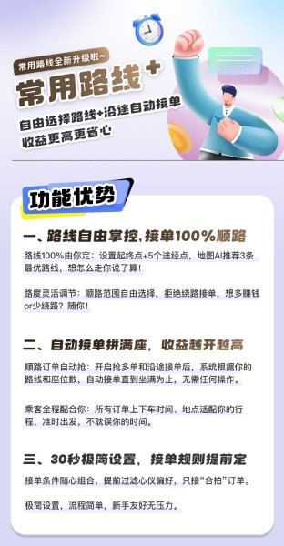 此次升级后,车主可设置8条常用路线,每条都可以由车主自定义具体行驶路径,还可设置5个途经点,让平台推荐订单更精准更顺路,此外还可设置周期性出行频次,让车主不用再重复设置。