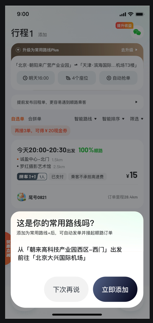 此外,如车主发布相同起终点行程达3次,将触发高频路线智能识别,平台会主动请车主确认:“是否一键升级为常用路线”。
