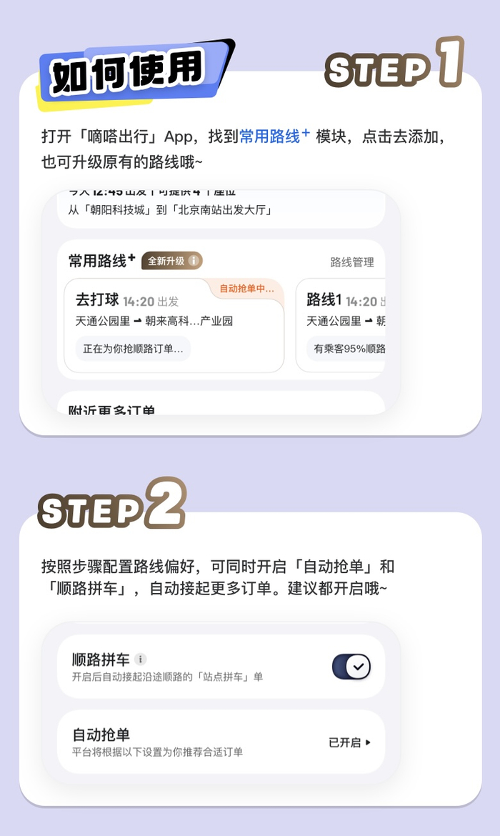 近日嘀嗒出行对常用路线功能进行了全面升级,通过车主自定义路线、自动抢单模式优化以及新增“顺路拼车”抢单功能,全方位提升顺风车主对顺路接单的掌控感,让订单更符合预期,更随心。