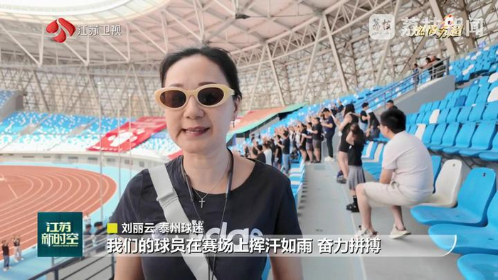 泰州球迷刘丽云说:“我们的球员在赛场上挥汗如雨 奋力拼搏,作为泰州球迷,我们要在看台上为他们呐喊。”