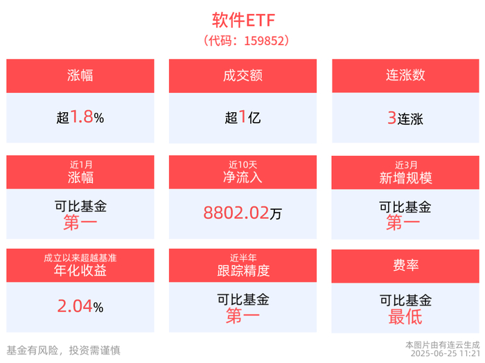 截至6月24日,软件ETF近1年净值上涨39.12%,指数股票型基金排名299/2871,居于前10.41%。从收益能力看,截至2025年6月24日,软件ETF自成立以来,最高单月回报为39.35%,最长连涨月数为3个月,最长连涨涨幅为69.40%,上涨月份平均收益率为10.18%。