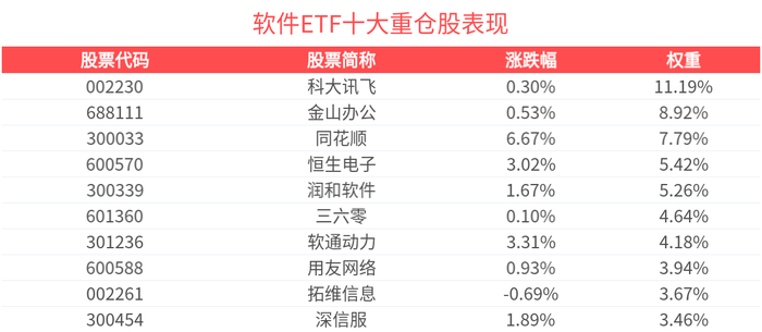 数据显示,截至2025年5月30日,中证软件服务指数前十大权重股分别为科大讯飞、金山办公、同花顺、润和软件、恒生电子、三六零、软通动力、拓维信息、用友网络、中国软件,前十大权重股合计占比59.85%。