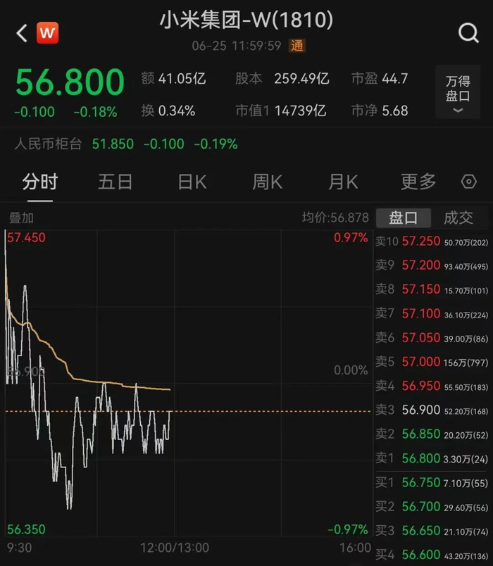 二级市场上,截至午间收盘,小米集团股价跌0.18%,报56.8港元,最新市值为1.47万亿港元。