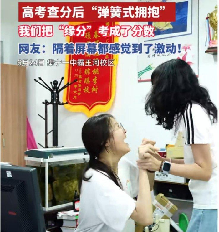 九派新闻消息,6月24日,内蒙古集宁一中霸王河校区。两女生相继查分626分和627分,后“弹簧式拥抱”,她们把“缘分”考成了分数,网友:隔着屏幕都感觉到了激动!