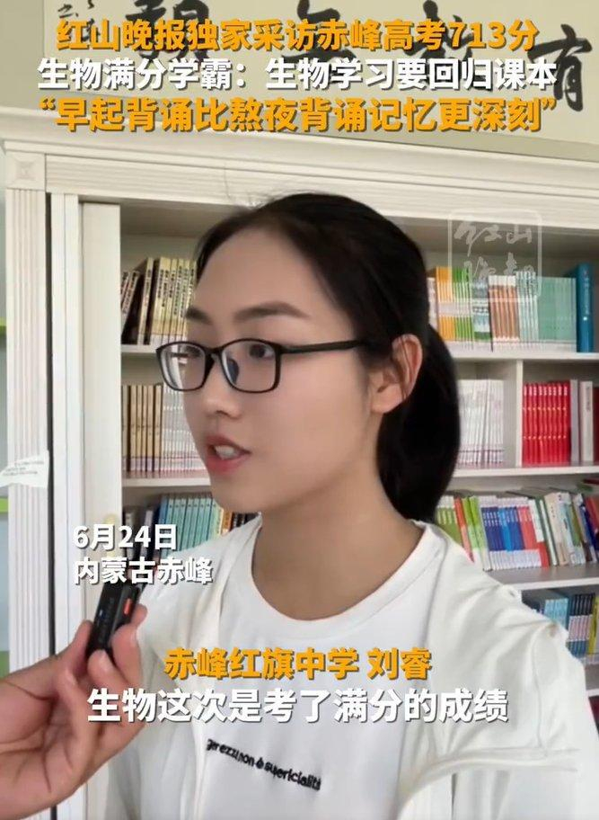 红山晚报消息,6月24日,内蒙古赤峰。赤峰红旗中学学生刘睿高考总分713分,语文135分,数学142.5分,英语143.5分,物理95分,化学97分,生物100分。她在接受采访时表示,生物学习要回归课本,“早起背诵比熬夜背诵记忆更深刻”。