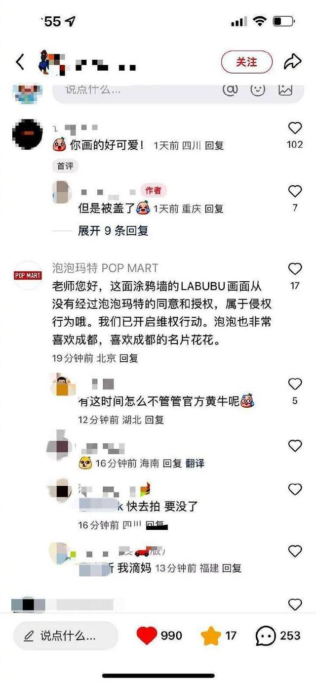 泡泡玛特官方账号曾评论涂鸦墙涉侵权