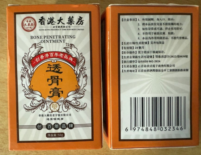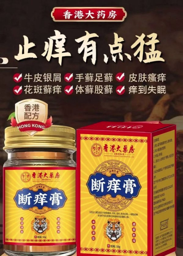 在该店,记者看到多款标称香港老牌的产品。一款“断痒膏”产品外包装显著标注“香港大药房”,下方小字“某某有限公司”字迹模糊,无法辨识。其广告宣称“香港老字号”“百年品牌地道药材”等,宣称“闪电止痒王 用完没痒迹”,适用“72种皮肤痒”。