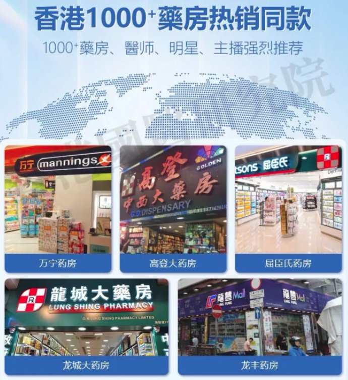 记者注意到,该商品还标注了“屈臣氏药房”“万宁药房”等5家香港药房为销售渠道。